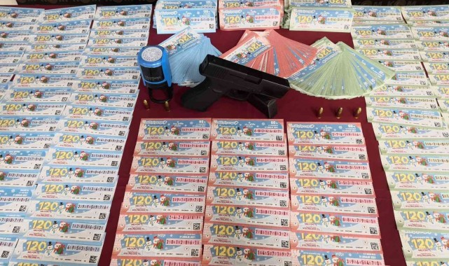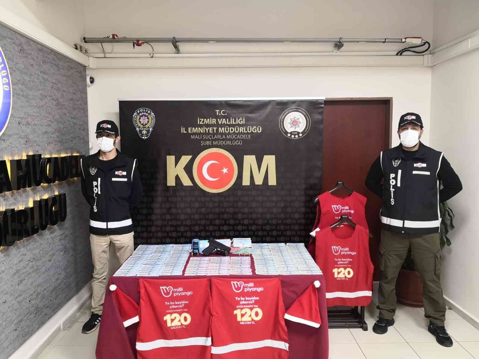 İzmir'de bir şahsın 2022 yılına ait sahte milli piyango biletlerini piyasaya süreceği esnada yakalanmasının ardından yapılan operasyonda, bin 816 adet yılbaşı Milli Piyango bileti, bir tabanca ve yelek, şapka ele geçirildi, olayla ilgili 4 şüpheli gözaltına alındı