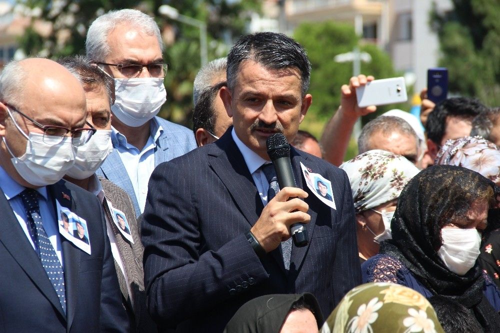 Törende konuşan Tarım ve Orman Bakanı Bekir Pakdemirli, şehit orman işçilerinin ailelerinin kendilerine emanet olduğunun altını çizdi. Şehitlere rahmet dileyen Bakan Pakdemirli, "Öncelikle Allah rahmet eylesin, mekanları cennet olsun. Çok anlamlı bir günde çok değerli Ali Yılmaz ve Nurullah Akbaş kardeşimi ebediyete uğurluyoruz. Her kim ki bu vatan için kurşun sıksın, göğsünü siper etsin; her kim ki bu vatanın bayrağı için, milleti için, devlet için hizmet etsin; onların hepsi bizim için mukaddestir. Kaybettiğimiz şehitlerimizi rahmetle anıyoruz. Huzurlarınızda teşekkürlerimizi iletiyoruz. Burada bu iki kardeşimiz görevlerini icra ederken yolda elim bir kaza ile karşılaştılar. Tabii ki böyle bir kaza ile karşılaşacaklarını bilselerdi daha dikkatli olurlardı. Çünkü geride kalanlar var, aileleri var. O aileler artık bize emanet. Rabbim şehit kardeşlerimizin taksiratlarını affetsin. 114 tane orman şehidimiz var bugüne kadar. Ben hep teşkilatımın arkasında durdum. Zaman zaman bu teşkilat haksız ithamlara maruz kaldı. Halbuki, askerimiz ve polisimizden sonra en çok şehit veren kuruluşumuz orman teşkilatımızdır. Bu da bir savaştır. Nasıl ki ordumuz ve polis teşkilatımız, düşmana ve teröriste karşı savaşıyorsa, bu arkadaşlarımız da ülkemizin yeşil kalması için, daha yeşil olması için, bir ağacın daha az yanması için vücutlarını siper ettiler. Maalesef çok acı kayıplarımız oldu. Bu acı kayıplarımızın hepsini de ormanımızda büyüyen her bitkide, her yeşillenen ağaçta, her çiçeğimizde anıyor olacağız. Ülkemizin daha yeşil olması için cansiperane, vücutlarını ateşe atmaktan, ateşle karşı karşıya kalmaktan çekinmeyen bu kardeşlerimizi bir kere daha rahmetle anıyorum. Allah rahmet eylesin, mekanları cennet olsun. Şehitlerimizin aileleri artık bize emanet. Biz aileler ile ilgili ne gerekiyorsa onları yapacağız. Artık şehitlerimizin anne ve babalarının çok geniş bir ailesi var. Biz de onların evladıyız. Ben bakanlığım adına, orman teşkilatı adına bu kardeşlerimizi ebediyete uğrarken, onlara Rabbimden rahmet niyaz ediyorum. Yaralı iki kardeşimiz var; onları da gün içerisinde ziyaret edeceğiz. Onlara da acil şifalar diliyorum" sözlerine yer verdi.