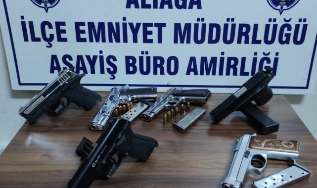 Aliağa İlçe Emniyet Müdürlüğü Asayiş Büro Amirliği, Yeni Mahallede bulanan bir kıraathanede silah kaçakçılığı yapıldığına yönelik bilgi aldı. Harekete geçen ekipler, pazarlık esnasında suçüstü yaptı. Baskın yapan ekipler, K.T., M.T., R.A., Y.K. ve E.Ö. isimli şahısları yakalayarak gözaltına aldı. Gözaltına alınan şahıslardan toplamda 6 adet çeşitli marka ve modellerde silahlar ele geçirilirken, dolu fişeklere de el konuldu. Gözaltına alınan şahıslar, emniyetteki işlemlerinin ardından sevk edildiği mahkemece tutuklandı.