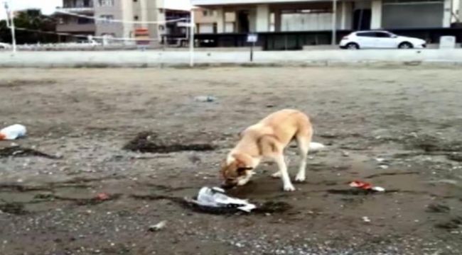 Güzelbahçe ilçesinde, bir sokak köpeğinin ölen martının üzerine toprak atma anı çevredeki biri kişi tarafından görüntülendi.