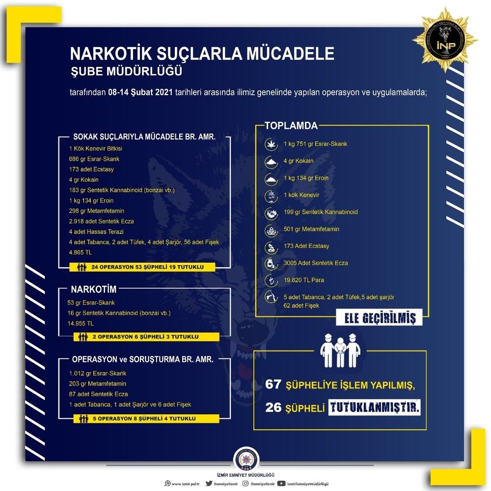 İzmir'de polis tarafından gerçekleştirilen denetim ve operasyonlarda son bir haftada çok miktarda uyuşturucu madde ele geçirilirken, olaylarla ilgili 26 şüpheli tutuklandı.