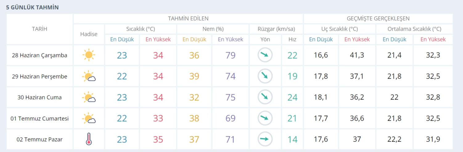 Hava sıcaklığında önemli bir değişiklik beklenmiyor. İzmir genelinde hava sıcaklıkları mevcut seviyelerini koruyacak. İklimin genel olarak ılıman olduğu İzmir'de, bu dönemde serin ve keyifli bir hava bekleniyor.Rüzgarlar genellikle kuzey yönlerden orta şiddette esecek. Bölgenin kuzey kesimlerinde zaman zaman kuvvetli rüzgarlar etkili olabilir. Hava durumuna bağlı olarak rüzgarın hızında değişiklikler olabilir, bu nedenle dikkatli olmakta fayda var.İzmir ve çevresindeki hava durumu hakkında yapılan tahminlere göre, az bulutlu ve parçalı bulutlu bir hava bekleniyor. Kısa süreli sağanak yağışlar ise özellikle Çanakkale'nin doğusu ve Balıkesir çevrelerinde görülecek. Hava sıcaklığı ve rüzgar hızı ise mevcut durumunu koruyacak. Güncel hava durumu bilgilerini takip etmek ve planlarınızı buna göre yapmak önemlidir.İzmir için Bayramda hava nasıl olacak? İşte izmir için beş günlük hava durumu tahmini raporu;