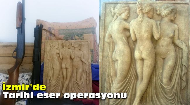 İzmir'in Menderes ilçesinde jandarma ekipleri tarafından düzenlenen operasyonda bir adet mermer kabartma tarihi eser ile iki adet ruhsatsız av tüfeği ele geçirildi.
