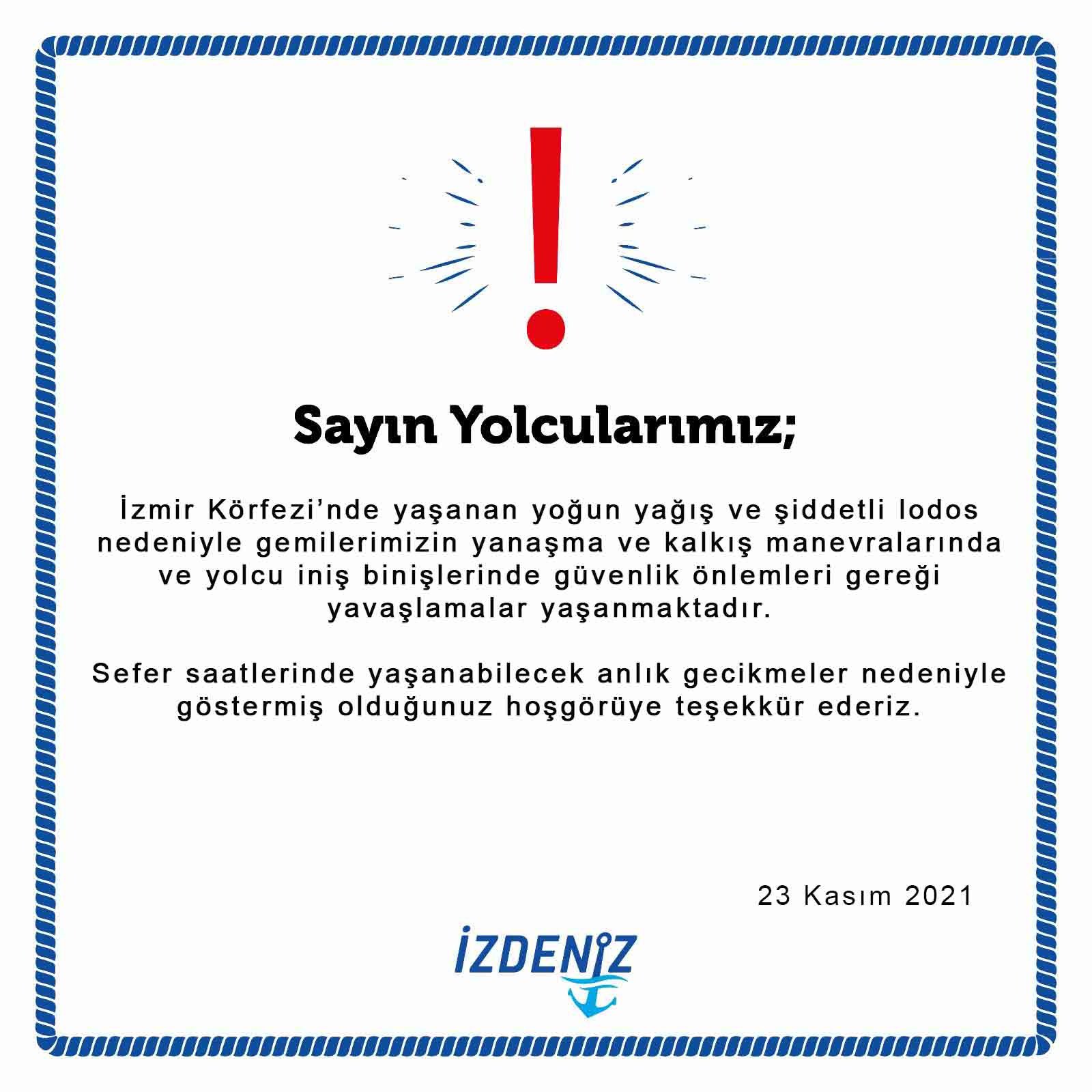 İzmir’de yaşanan yoğun sağanak yağış sebebiyle, kara yolu ulaşımı erken saatlerde tıkanmaya başlamıştı. Yağışın şiddetinin artmasıyla birlikte deniz seferleri iptal oldu. İZDENİZ’in sosyal medya hesaplarından yapılan açıklamada şu ifadeler kullanıldı:“İzmir Körfezi'nde yaşanan yoğun yağış ve şiddetli lodos nedeniyle gemilerimizin yanaşma ve kalkış manevralarında ve yolcu iniş binişlerinde güvenlik önlemleri gereği yavaşlamalar yaşanmaktadır.Sefer saatlerinde yaşanabilecek anlık gecikmeler nedeniyle göstermiş olduğunuz hoşgörüye teşekkür ederiz.”