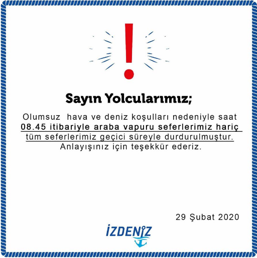 Çevre 29 Şubat 2020 - 09:12 İzmir'de vapur seferleri iptal edildi İzmir'de olumsuz hava koşulları nedeniyle vapur seferleri iptal edildi. Çevre 29 Şubat 2020 - 09:12 Yorumlar TAKİP ET Dinle Yazdır A Büyüt A Küçült Yorumlar İzmir'de olumsuz hava koşulları nedeniyle vapur seferleri iptal edildi. İzmir Denizcilik AŞ'den yapılan açıklamada, olumsuz hava ve deniz koşulları nedeniyle arabalı vapur hariç tüm seferlerin 08.45 itibarıyla geçici süreyle durdurulduğu belirtildi. # İzmİr# İzdenİz# vapur# sefer# iptal# edildi YORUMLAR adlı kullanıcıya cevap x Gönder İlginizi Çekebilir Yaz Erkenden Geliyor: Baharda Sıcaklıklar Rekor Kıracak İşte İzmir'in barajlarında güncel durum! İzmir'de yağışlara 3 gün mola! Yalancı Bahara Aldanmayın: Sağanak ve Fırtına Kapıda Son Haberler Folkart Academy, İkinci Dönem Mezunlarını Verdi Gaziemir’den okul saldırılarına tepki Gaziemir’den okul saldırılarına tepki Gülistan Doku soruşturması: Eski Tunceli Valisi Sonel açığa alındı Dolar ve Enflasyon Beklentisi Yükseldi, Büyüme Frenledi: İşte Merkez... Memurlara kötü haber! Servisler kalkıyor Memurlara kötü haber! Servisler kalkıyor