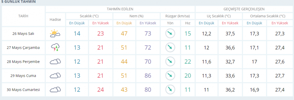 İzmir'de bayram tatili ve sokağa çıkma yasağının ardından bulutlu bir hava bekleniyor. Kısıtlamanın kalkacağı 27 Mayıs Çarşamba günü ise İzmir'i yağmurlu bir hava karşılayacak. Hafta genelinde hava 21-24 dereceler arasında seyredecek. 28 Mayıs Perşembe günü rüzgar ortalamanın biraz üzerinde olacak.