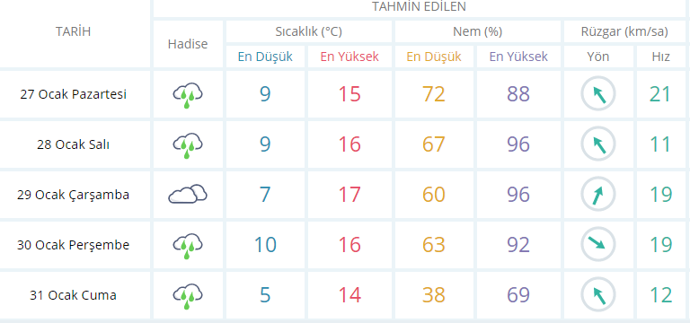 Kentte hava sıcaklığığının nispeten artacağı 5 günlük periyodun 4 gününde sağanak yağış beklenirken, en yüksek sıcaklıkların 14 ila 17 derece arasında olması bekleniyor.İzmir’de Ocak ayının son haftasında nem oranının ise yüzde 90'ların üzerine çıkacağı görülüyor. 5 günlük hava tahmini rapolarında, Çarşamba günü dışında tüm günlerde yağmur yağacağı tahmin ediliyor.