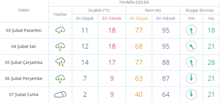 Kentte yeni haftanın ilk 4 günü sağanak yağış bekleniyor. İzmir'de en yüksek sıcaklıklar da gün be gün düşüş gösterecek. Nem oranının yüzde 95'lere kadar çıkacağı periyotta termometreler Perşembe ve Cuma günü 9 dereceye kadar düşmesi bekleniyor.