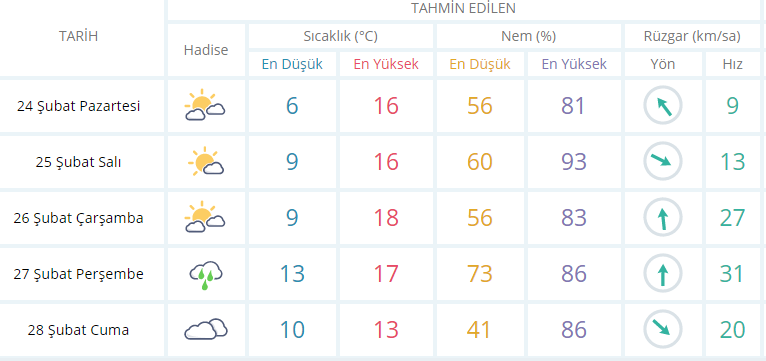 En yüksek sıcaklıkların 18 dereceye kadar çıkacağı yeni haftanın ilk 3 gününde yağış beklenmezken, Perşembe günü kentte yağmur bekleniyor. Bulutlar kenti Perşembe günü saracak ve sağanak yağış beklenen günün ardından termometreler de geri saymaya başlayacak. Nem oranının zaman zaman yüzde 90'ların üzerine çıkması bekleniyor.