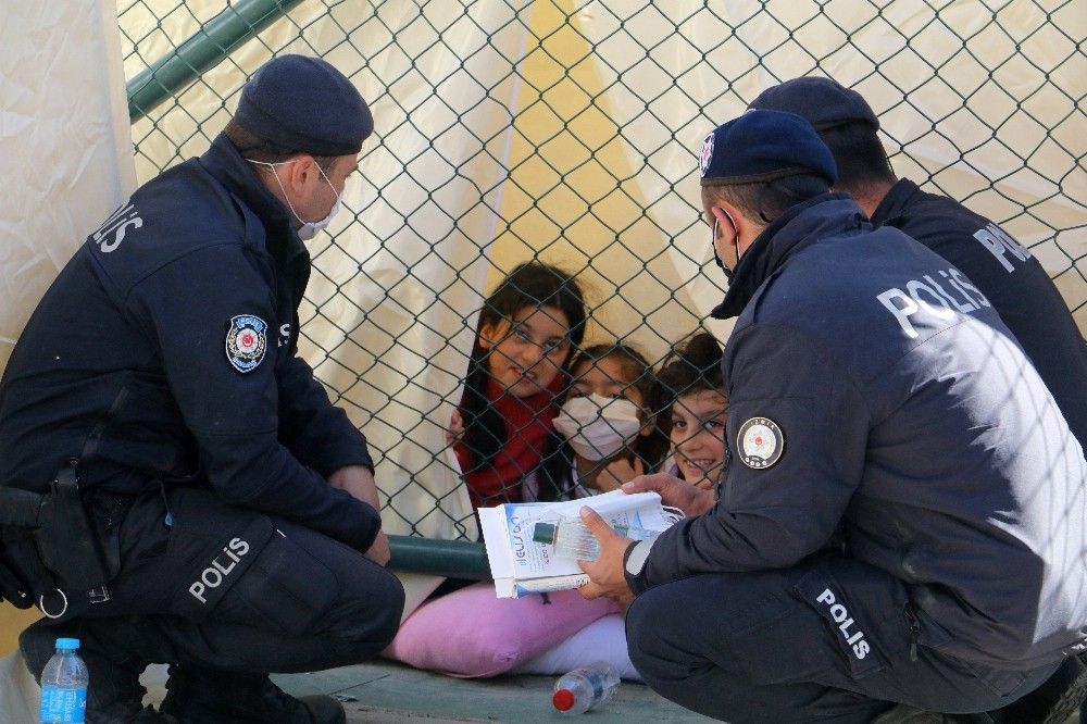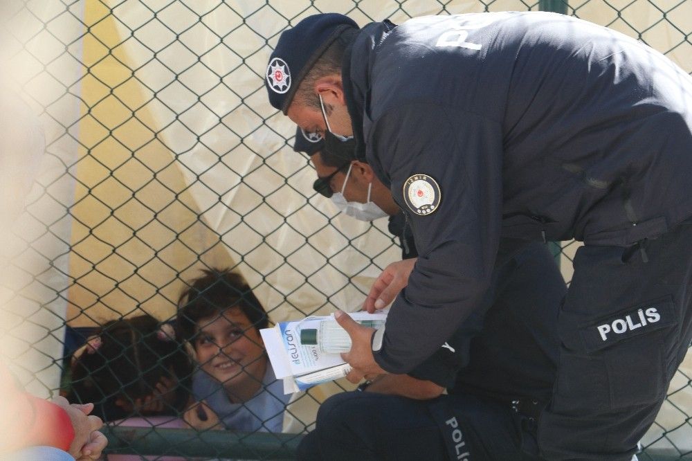 Ardından çocuklarla uzun süre sohbet eden polis ekipleri ve onlara sonradan dahil olan bir Kızılay yetkilisi, çocukların yüzlerini güldürdü.