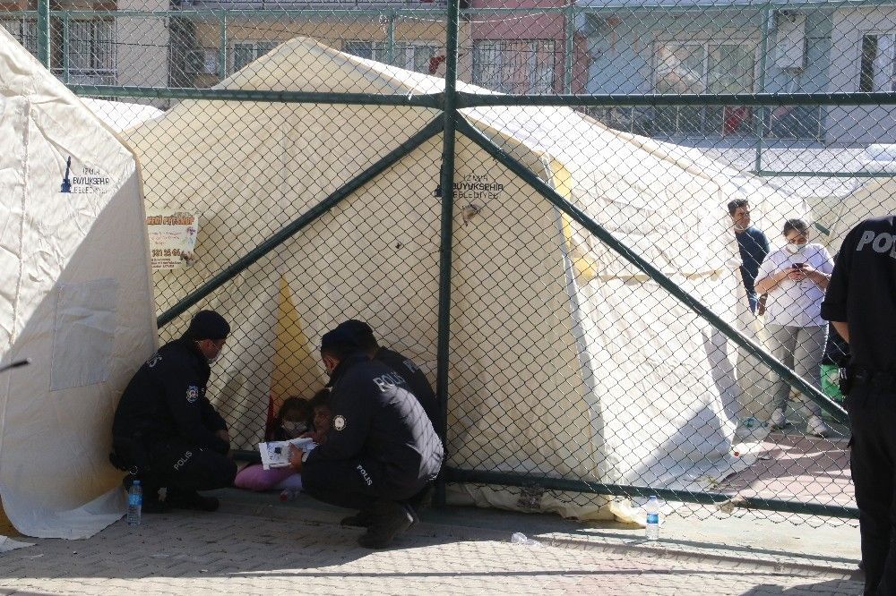 Polis memurları, çadır içerisinden bakan çocukların enkazın bulunduğu apartman arasındaki görüş açısını kapattı, sohbetleriyle de onları güldürdü.