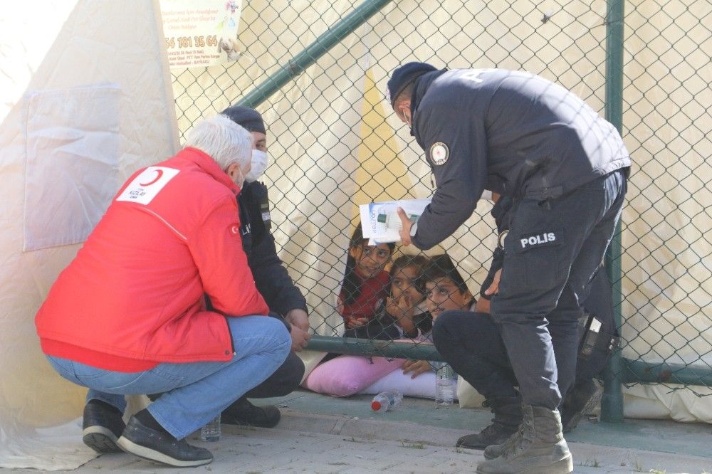 Yıkımın yapıldığı alanın hemen 100 metre uzağındaki çadırın içinden etrafa bakınan 3 çocuğu fark eden polis memurları, maske ve kolonya verme bahanesiyle çocukların yanına gitti.