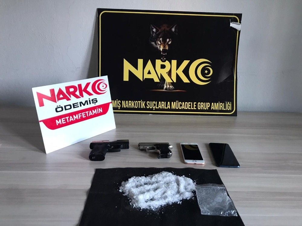 Ödemiş Narkotik Suçlarla Mücadele Grup Amirliği ekipleri, ilçe genelinde yaptığı operasyonlarla zehir tacirlerine darbe vurdu. Ekipler, önceden belirlenen değişik adreslerde yapılan operasyonlarda toplam 440 kök Hint keneviri, 82 gram metamfetamin, bin 124 gram kubar esrar, 148 gram esrar, 1 adet hassas terazi ve 4 ruhsatsız tabanca ele geçirdi.