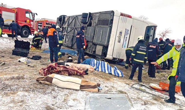 Konya-Aksaray yolunun 50’nci kilometresinde dün saat 06.30 sıralarında, İzmir’den Kapadokya’ya giden Metin Çetintaş (49) yönetimindeki 48 J 8149 plakalı Enko Tur’a ait tur otobüsü, yoğun sis ve yoldaki buzlanma nedeniyle kontrolden çıkıp şarampole devrildi. Kazada 2’si şoför, 45’i yolcu 47 kişinin bulunduğu otobüste yolculardan Yasemin Özkan, Nazan Uysal, Mustafa Karakan, Mehmet Alçık, Büşra Nur Kaçan ve Aslıhan Akdoğan yaşamını yitirdi, 41 kişi de yaralandı.3 SAVCI İLE SORUŞTURMAİhbar üzerine kaza yerine sağlık, AFAD, itfaiye, polis ve jandarma ekipleri sevk edildi. Yaralılar, ambulanslarla Konya Şehir Hastanesi, Meram Tıp Fakültesi ve Selçuklu Üniversitesi Tıp Fakültesi’ne kaldırıldı. Yaralıların çoğunun, tedbir amaçlı sağlık kontrolünden geçirilmek üzere hastaneye kaldırıldığı belirtildi. Kazanın ardından Konya Cumhuriyet Başsavcılığı da 3 savcı gözetiminde soruşturma başlattı. Soruşturma kapsamında sürücü Metin Çetintaş ve yedek şoförün, tedavilerinin ardından gözaltına alındığı belirtildi.BAKAN'DAN 'GEÇMİŞ OLSUN'Konya Valisi Vahdettin Özkan hastanedeki yaralıları ziyaret edip sağlık durumları hakkında bilgi aldı. Vali Özkan’ın ziyareti sırasında, İçişleri Bakanı Süleyman Soylu da yaralılarla telefonda görüşerek “Geçmiş olsun” dileklerini iletti.