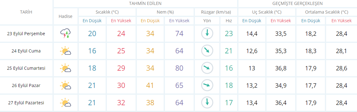 Meteoroloji Genel Müdürlüğü verilerine göre Ege Bölgesi soğuk ve yağışlı havanın etkisi altına giriyor. İzmir'de bu gece yarısından itibaren gök gürültülü sağanak yağışın etkili olması bekleniyor. Yağışın Perşembe günü boyunca devam etmesi bekleniyor. Kentte gece sıcaklıkları ise 16 dereceye kadar düşecek. İşte İzmir'in 5 günlük hava durumu...