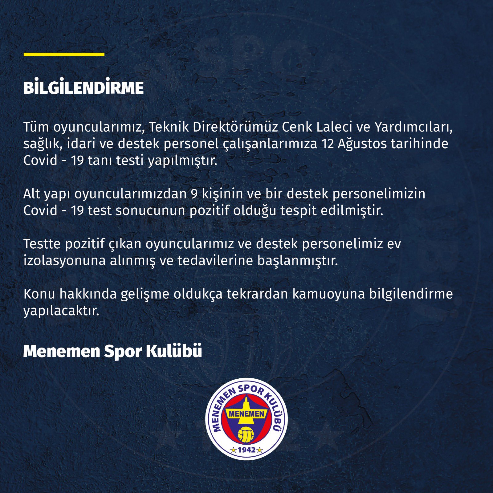 Kulüpten yapılan yazılı açıklamada altı yapıda 9 ve bir tesis personelinin testlerinin pozitif çıktığı aktarıldı. 10 kişinin ev izolasyonuna alındığı ve tedavilerinin sürdüğü aktarıldı.