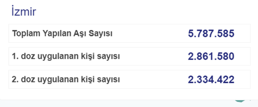 1.doz uygulanan kişi sayısı 2 milyon 861 bin 580 olurken, 2. doz uygulanan kişi sayısı 2 milyon 334 bin 422 kişi oldu. Toplam yapılan aşı sayısı ise 5 milyon 787 bin 585 oldu.