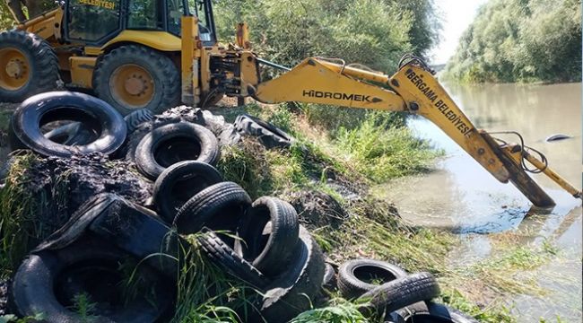 Bakırçay Sindel Köprüsü mevkiinden gelen bir ihbarı değerlendiren Bergama Belediyesi Zabıta Müdürlüğü ekipleri, olay yerine gittiklerinde korkunç manzara ile karşılaştı. Bakırçay’a atılan hurda lastiklerin çıkarılması için Belediye Fen İşleri Müdürlüğü ekipleri anında çalışma başlattı. Tüm gün süren çalışma ile 2 kamyon dolusu hurda lastik Bakırçay’dan çıkarılırken, en az iki kamyon dolusu daha lastik olduğu tahmin ediliyor. Bakırçay’ın temizlenmesi için çalışmalar devam ediyor.