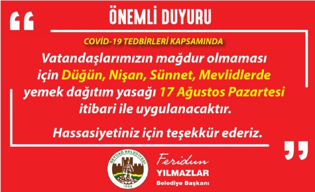 Beydağ Belediye Başkanı Feridun Yılmazlar kurul tarafından ilçede uygulanacak yeni kuralları açıkladı. Alınan kararlar doğrultusunda; düğün, nişan sünnet mevlitlerde yemek dağıtımlarının yapılmamasına ve organizasyonların 3 saat içinde başlayıp bitirilmesine karar verildi. Cenaze törenlerine sadece birinci derece yakınlarının kalıtımının sağlanması istendi.