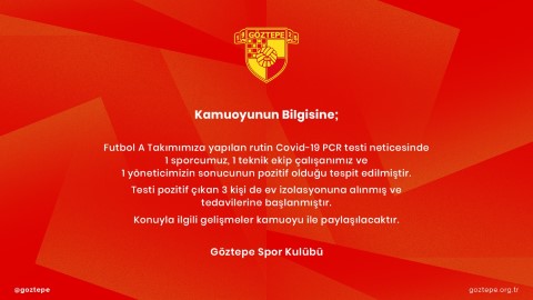 Bugün de Göztepe, biri futbolcu olmak üzere 3 kişinin covid-19 testinin pozitif çıktığını açıkladı. Kulüp’ten yapılan açıklamada, teknik ekip çalışanı ve yöneticide virüs tespit edildiği aktarıldı.