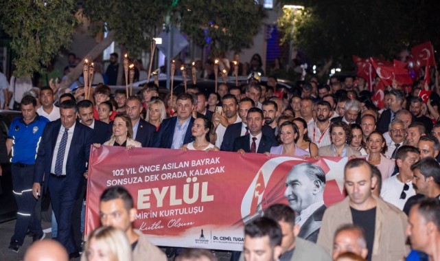 İzmir'in kurtuluşunun 102’nci yıl dönümü coşkulu kutlamalara sahne oldu. İzmir Büyükşehir Belediyesi'nin ev sahipliğinde düzenlenen etkinlikler tüm gün devam etti. Program kapsamında düzenlenen Fener Alayı yürüyüşü ile kutlamalar geceye taştı. Yürüyüşe İzmir Büyükşehir Belediye Başkanı Dr. Cemil Tugay ve eşi Öznur Tugay, Cumhuriyet Halk Partisi (CHP) İzmir İl Başkanı Şenol Aslanoğlu, CHP İzmir Milletvekili Ednan Arslan, ilçe belediye başkanları ve eşleri, İzmir Büyükşehir Belediyesi bürokratları, sivil toplum kuruluşu temsilcileri, meclis üyeleri, muhtarlar ve İzmirliler katıldı. “Mustafa Kemal’in askerleriyiz” Fener Alayı yürüyüşü, Cumhuriyet Meydanı'ndan başladı. Başkan Dr. Cemil Tugay ve beraberindeki protokol, ellerinde “102 yıl önce asılan bayrak sonsuza dek orada kalacak. 9 Eylül İzmir’in kurtuluşu” yazılı pankartla, Cumhuriyet Meydanı’ndan Gündoğdu Meydanı’na, Plevne Bulvarı üzerinden Kültürpark Lozan Kapısı'na ilerledi. Fener Alayı yürüyüşünde İzmirliler ellerinde 350 metrelik dev Türk bayrağını Kordon güzergahı boyunca taşıdı. İzmir Büyükşehir Belediyesi Bandosu eşliğinde devam eden kortejde, İzmir Marşı’ndan Onuncu Yıl Marşı’na çok sayıda eser hep bir ağızdan söylendi. İzmir Büyükşehir Belediyesi Gençlik ve Spor Kulübü’nün genç sporcuları ellerinde meşalelerle kurtuluşun gecesi 9 Eylül’ü aydınlattı. 7’den 70’e İzmirliler ellerinde bayraklarla yürürken korteje katılamayanlar ise balkonlarından, pencerelerinden bayraklarla ve alkışlarla coşkuya ortak oldu. Yürüyüş boyunca İzmirliler hep bir ağızdan “Mustafa Kemal’in askerleriyiz” sloganları attı. Kültürpark Lozan Kapısı'na ulaşan kortej İzmir Marşı söyleyerek Fener Alayı’nı noktaladı. 9 Eylül coşkusu 93’üncü İzmir Enternasyonal Fuarı’nda Haluk Levent konseriyle devam etti.