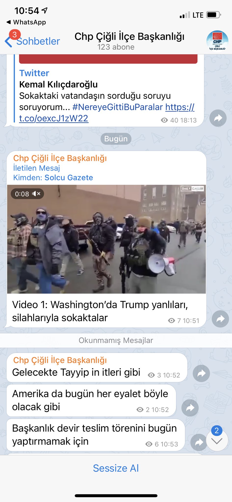 CHP Çiğli İlçe Başkanlığı'nın olduğu iddia edilen bir sayfada ABD'de yaşanan bir olayı paylaşılırken, altına "Gelecek Tayyip'in itleri gibi, Amerika'da bugün her eyalet böyle olacak gibi. Başkanlık devir teslim törenini bugün yaptırmamak için" mesajları paylaşıldı.