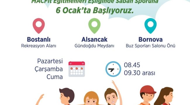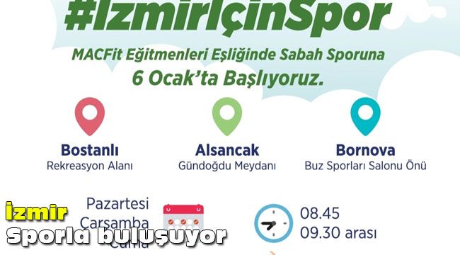 İzmir Büyükşehir Belediyesi Gençlik ve Spor Kulübü İzmirlileri sabah sporuna çağırıyor. Bostanlı Rekreasyon Alanı, Alsancak Gündoğdu Meydanı ve Bornova Buz Sporları Salonu’nun önünde haftanın üç günü spor aktiviteleri düzenlenecek. Uzman eğitmenler eşliğindeki aktivitelere katılım ücretsiz olacak.