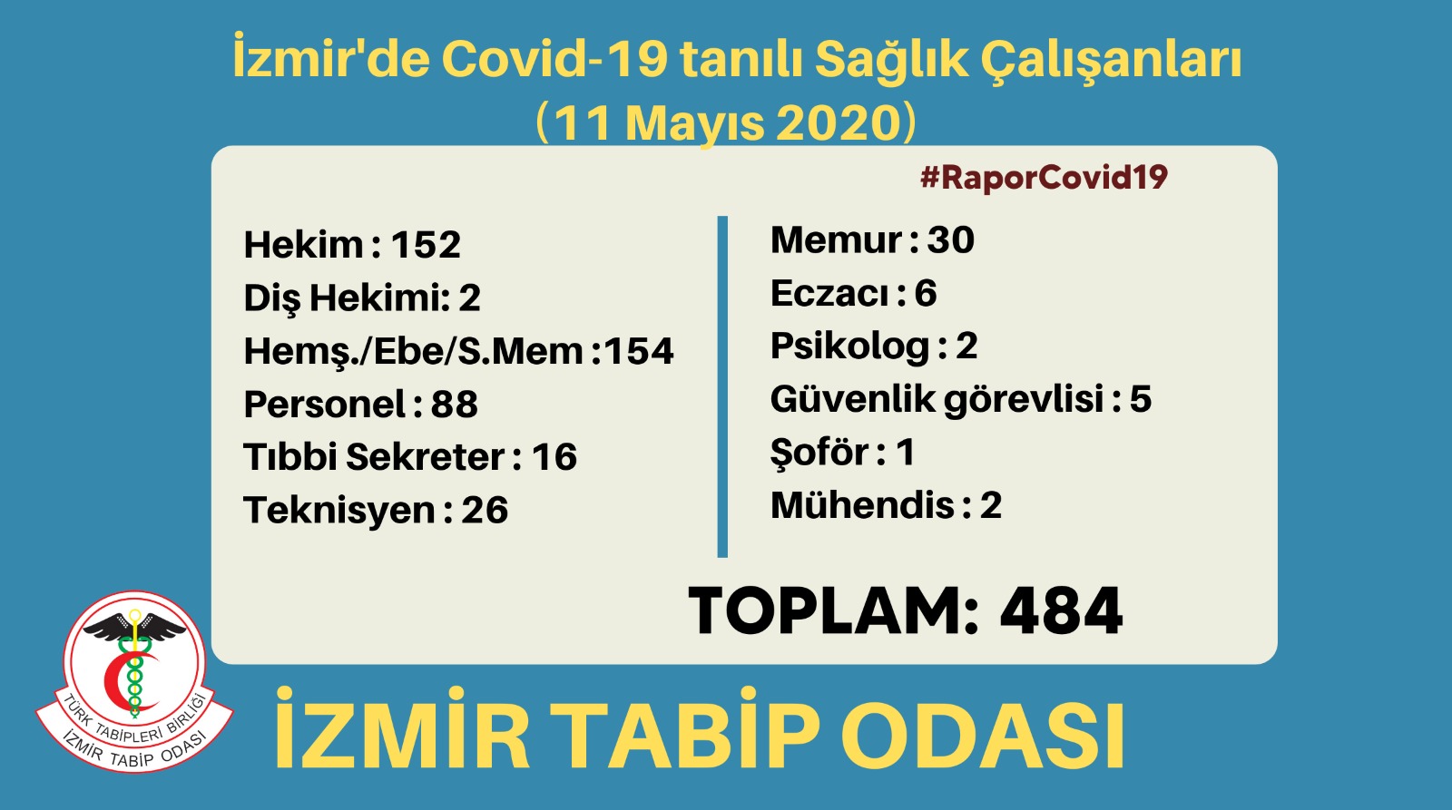 Tabip Odası tarafından yapılan açıklamada bugüne kadar; 152 hekim, 2 diş hekimi, hemşire-ebe- sağlık memuru alanında 154 kişi, 16 tıbbi sekreter, 88 personel, 26 teknisyen, 30 memur, 6 eczacı, 2 psikolog, 5 güvenlik görevlisi, 1 şoför ve 2 mühendisin koronavirüs testinin pozitif çıktığı belirtildi.
