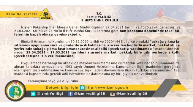 İzmir Valiliği İl Hıfzıssıhha Kurulu kararına göre, tam kapanma döneminde tekel büfelerin kapalı olması gerektiği belirtilen açıklamada, "Sokağa çıkma kısıtlaması uygulanan süre ve günlerde açık kalmasına izin verilen her türlü market, bakkal gibi iş yerlerinde sokağa çıkma kısıtlaması süresince alkollü içecek satışı yapılmaması, 29 Nisan-17 Mayıs tarihleri arasında market, bakkal, büfe gibi yerlerde alkollü içecek satışına izin verilmemesine oy birliğiyle karar verilmiştir" denildi.