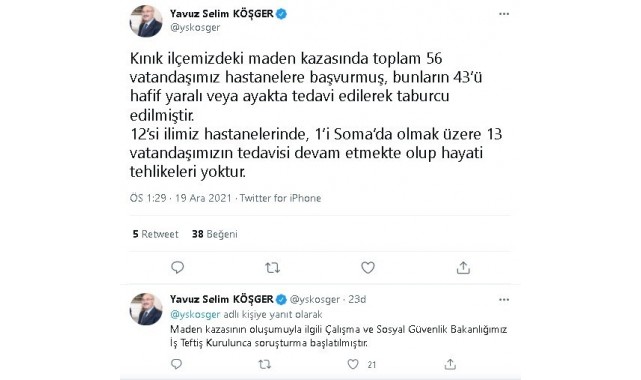 "Kınık ilçemizdeki maden kazasında toplam 56 vatandaşımız hastanelere başvurmuş, bunların 43'ü hafif yaralı veya ayakta tedavi edilerek taburcu edilmiştir. 12'si ilimiz hastanelerinde, 1'i Soma'da olmak üzere 13 vatandaşımızın tedavisi devam etmekte olup hayati tehlikeleri yoktur. Maden kazasının oluşumuyla ilgili Çalışma ve Sosyal Güvenlik Bakanlığımız İş Teftiş Kurulunca soruşturma başlatılmıştır."
