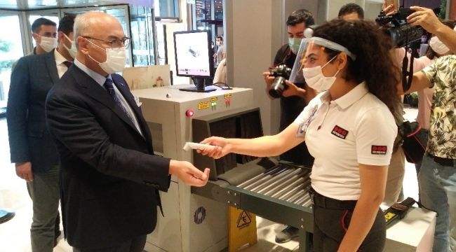 Alışveriş merkezine girişte ateşi ölçülen Vali Köşger, kapıdaki görevlilerde alınan önlemlerle ilgili bilgi aldı.