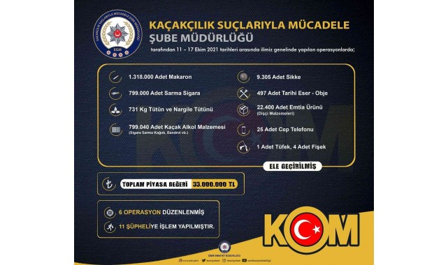 İzmir İl Emniyet Müdürlüğü Kaçakçılık Suçlarıyla Mücadele Şube Müdürlüğü ekipleri, 11-18 Ekim tarihleri arasında il genelinde çeşitli adreslere 6 ayrı operasyon gerçekleştirdi. Operasyonlarda adreslerde yapılan aramalarda 1 milyon 318 bin adet makaron, 799 bin adet sarma sigara, 731 kilogram tütün ve nargile tütünü, 799 bin 40 adet kaçak sigara malzemesi, 9 bin 305 adet sikke, 497 adet tarihi eser, 22 bin 400 adet kaçak emtia ürünü, 25 adet cep telefonu ile 1 adet tüfek ve 4 adet fişek ele geçirildi. Ele geçirilen kaçak ürünlerin piyasa değerinin 33 milyon lira olduğu değerlendirilirken, olaylarla ilgili 11 şüpheli hakkında işlem yapıldığı öğrenildi.
