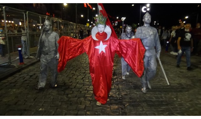İzmir'in işgalden kurtuluşunun 99. yıl dönümü sabahın ilk saatlerinden itibaren başlayan birbirinden renkli görüntüler ile kutlanmaya devam ediyor. İzmir Büyükşehir Belediyesi tarafından düzenlenen etkinlikler ile kent genelinde yaşanan kutlamalar akşam saatlerinde yerini Fener Alayı yürüyüşü ve Türk Rock müziğinin efsane grubu Athena konserine bıraktı. İlk olarak saatler 20.15'i gösterdiğinde Cumhuriyet Meydanı'nda toplanan binlerce vatandaş, 350 metrelik dev Türk bayrağını taşıyarak Fener Alayı yürüyüşü gerçekleştirdi. Yürüyüşe katılan vatandaşlara kordonda bulunan İzmirliler ve evlerinin balkonlarına çıkan vatandaşlar da alkışlar ile eşlik ederken, coşkulu kalabalığın yürüyüşü Gündoğdu Meydanı'nında son buldu.