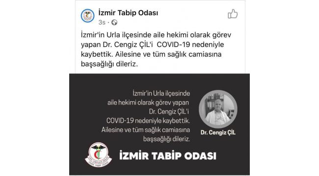 Urla ilçesinde aile hekimi olarak görev yapan Dr. Cengiz Çil, yakalandığı korona virüs (Covid-19) nedeniyle yaşamını yitirdi. İzmir Tabip Odası tarafından sosyal medyadan yapılan paylaşımda, "İzmir'in Urla ilçesinde aile hekimi olarak görev yapan Dr. Cengiz Çil'i Covid-19 nedeniyle kaybettik. Ailesine ve tüm sağlık camiasına başsağlığı dileriz" denildi.