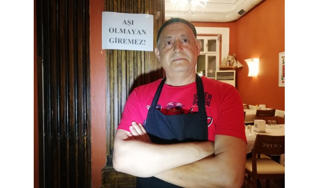 İzmir'in Konak ilçesinde bulunan ve işletmecisi olduğu restoranın girişine "Aşı olmayan giremez" yazısını yazan işletme sahibi Kemal Özçakar (60), "Amacım aşı çalışmalarına destek vermek ve aşı olmayanları müşteri olarak kabul etmeyeceğiz" dedi.