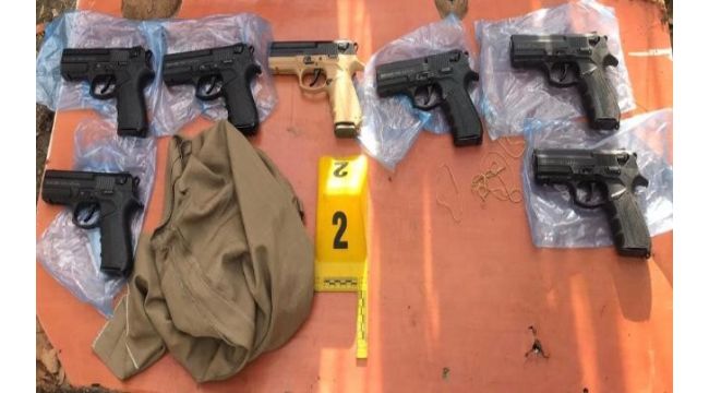 Şüphelinin depo olarak kullandığı ikametin bahçesinde yapılan aramalarda, 13 adet 9 mm çapında üzerinde seri numarası bulunmayan tabanca, 11 adet 7,65 mm çapında üzerinde seri numarası bulunmayan tabanca, 12 adet 9 mm çapında tabanca şarjörü, 1 adet av tüfeği, bol miktarda değişik çap ve markada tabanca fişeği, 1 adet 100 litre hacminde plastik bidon, 1 adet mengene aleti, Bir miktar silah bakım temizlik malzemeleri, 2 adet 10-15 litre hacminde plastik bidonlar, 1 adet cep telefonu ve sim kartı, 5 adet sprey boya kutusu, 1 adet R.G. adına düzenlenmiş kimlik kartı ele geçirildi. Şüphelinin emniyetteki sorgusunun devam ettiği öğrenildi.