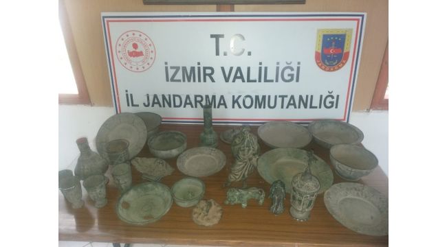 İzmir İl Jandarma Komutanlığı Kaçakçılık ve Organize Suçlarla Mücadele Şube Müdürlüğü (KOM) ekipleri, Urla'nın Kuşçular Mahallesi'nde tarihi eser satılacağı bilgisi üzerine çalışma başlattı. Urla İlçe Jandarma Komutanlığı ve Jandarma KOM ekipleri, H.A. isimli şahsa ait aracı yol kontrolünde durdurdu. Araçta yapılan aramada Bizans dönemine ait olduğu değerlendirilen 22 adet bronz obje, 2 adet bronz aslan heykeli ile 2 adet bronz insan heykeli ele geçirildi. Ele geçirilen tarihi eserler İzmir Müze Müdürlüğüne teslim edilirken, araçta bulunan H.A. ve M.Y. gözaltına alındı. Gözaltına alınan şüphelilerin adli işlemleri sürüyor.