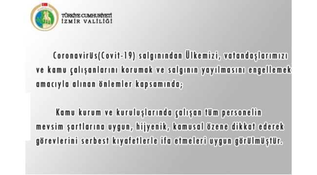 İzmir Valiliğinin sosyal medya hesabından yapılan açıklamada, "Korona virüsü (Covid-19) salgınından ülkemizi, vatandaşlarımızı ve kamu çalışanlarını korumak ve salgının yayılmasını engellemek amacıyla alınan önlemler kapsamında kamu kurum ve kuruluşlarında çalışan tüm personelin mevsim şartlarına uygun hijyenik, kamusal özene dikkat ederek görevlerini serbest kıyafetlerle ifa etmeleri uygun görülmüştür" denildi.