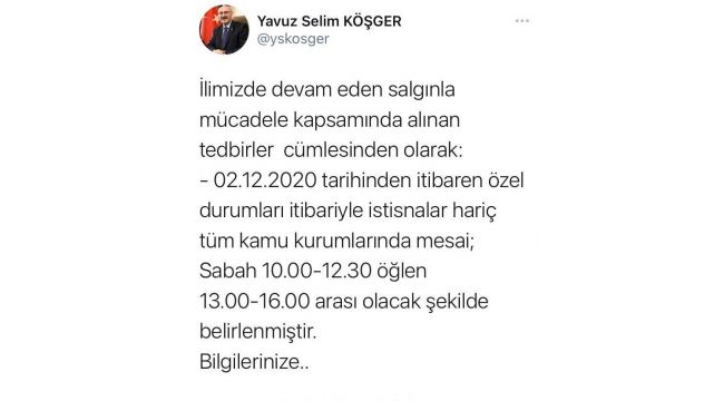 İzmir Valisi Yavuz Selim Köşger resmi Twitter hesabından yaptığı açıklamada, "02.12.2020 tarihinden itibaren özel durumları itibariyle istisnalar hariç tüm kamu kurumlarında mesai; sabah 10.00-12.30, öğle 13.00-16.00 arası olacak şekilde belirlenmiştir" yazdı.