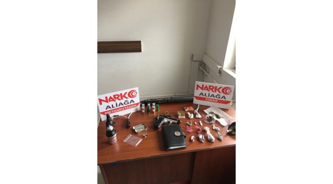 Edinilen bilgiye göre, Aliağa İlçe Emniyet Müdürlüğü Narkotik Suçlarla Mücadele Grup Amirliği ekiplerince, Dikili ilçesi Çandarlı Mahallesi'nde uyuşturucu madde ticareti yapan ve kullanan şahıslara yönelik çalışma düzenlendi. Yapılan çalışmaların ardından tespit edilen S.S. isimli şüphelinin ikametinde ve aracında arama çalışmaları yapıldı. Yapılan aramalarda, 15 adet fişeklenmiş esrar maddesi, metamfetamin maddesi, 1 adet tabanca ve bu tabancaya ait 7 adet fişek, 2 adet uyuşturucu satışından elde edildiği değerlendirilen bir miktar döviz ve Türk lirası ele geçirildi. Gözaltına alınan S.S. isimli şüpheli şahıs emniyetteki işlemlerin ardından uyuşturucu ticareti yapmak suçundan gözaltına alınarak emniyete götürüldü. Emniyetteki işlemlerinin ardından adliyeye sevk edilen şahıs, çıkarıldığı mahkemece tutuklandı.