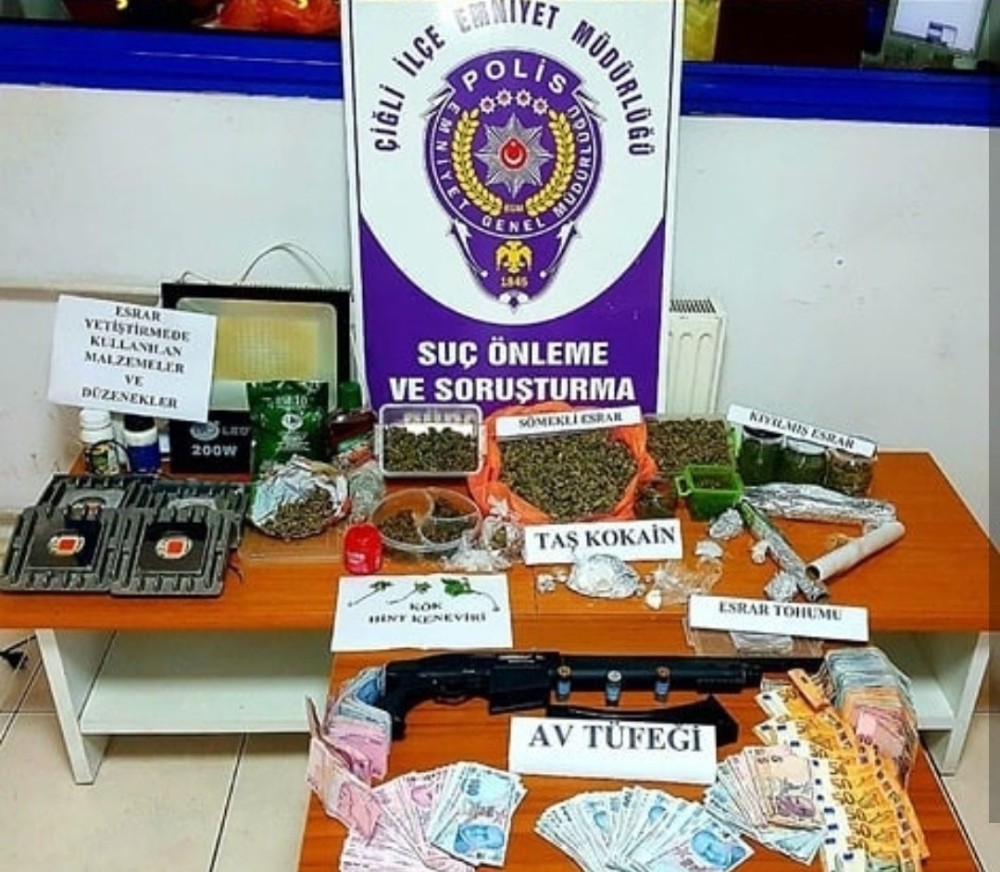 Edinilen bilgiye göre, Çiğli İlçe Emniyet Müdürlüğü ekipleri tarafından uyuşturucu ticaretinin önlenmesine yönelik önceden belirlenen bir adrese, adli makamlardan alınan arama kararının ardından operasyon düzenlendi. Düzenlenen operasyon sonucunda; 2 kilo 721 gram esrar, 73 gram kokain, 3 kök Hint keneviri, esrar maddesi iklimlendirmede kullanılan 5 adet ledli ısıtıcı, uyuşturucu madde tartım ve paketlemede kullanılan çeşitli malzemeler ile birlikte uyuşturucu madde ticaretinden elde edildiği değerlendirilen 51 bin 760 TL, 555 Euro ve 50 Dolar nakit para ve 1 adet ruhsatsız av tüfeği ele geçirildi.