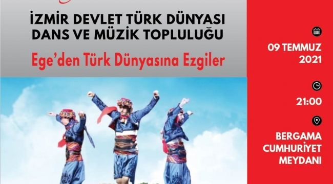 T.C. Kültür ve Turizm Bakanlığı Güzel Sanatlar Genel Müdürlüğü “Yaz Konserleri’’ kapsamında, İzmir Devlet Türk Dünyası Dans ve Müzik Topluluğu, “Ege’den Türk Dünyasına Ezgiler’ konserini sanatseverlerle buluşturmaya hazırlanıyor.