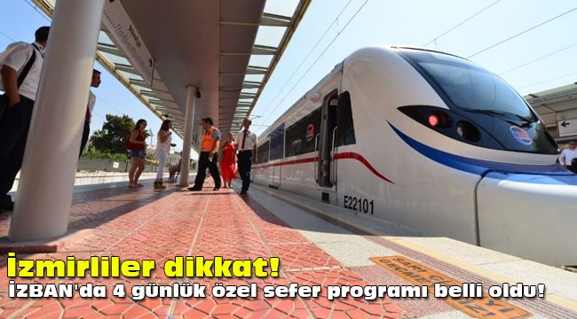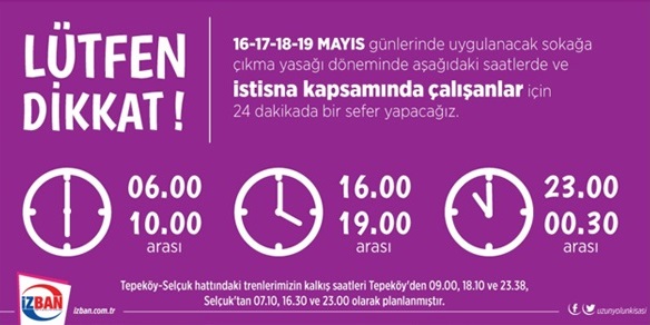 İZBAN trenleri, sokağa çıkma yasağının uygulanacağı 16-17-18 ve 19 Mayıs’ta 4 günlük süreçte Aliağa-Tepeköy arasında 06.00-10.00 / 16.00-19.00 ve 23.00-00.30 saatleri arasında 24 dakikada bir sefer yapacak.