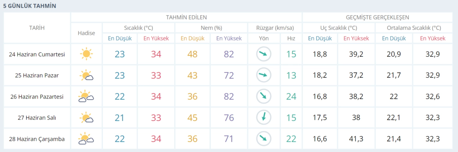 Bugün itibarıyla hava sıcaklığı 1 ila 2 derece artacak ve mevsim normallerine uygun bir seviyede olacak. Rüzgar genellikle kuzeyli yönlerden hafif kuvvette esecek, kıyı kesimlerde ise zaman zaman orta kuvvette hissedilecek.Meteoroloji tarafından yapılan açıklamada, güncel olarak herhangi bir hava durumu uyarısı bulunmadığı belirtilmektedir. Ancak, hava durumunu takip etmek ve ani değişikliklere karşı dikkatli olmak her zaman önemlidir.İzmir ve çevresindeki vatandaşlar, günlük aktivitelerini planlarken bu hava durumu tahminlerini göz önünde bulundurabilirler. Hava sıcaklığının artmasıyla birlikte güneşli ve açık bir hava beklenmektedir. İzmir'in güzelliklerini keşfetmek ve keyifli bir zaman geçirmek için uygun bir dönem olabilir.İşte İzmir için beş günlük hava durumu tahmini raporu;