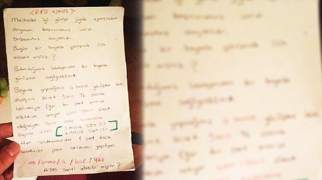 Tek sayfalık bir notta jigolo adayı arandığında neler söylenmesi gerektiği yazıyor. Nota göre adaya önce başvurusunun kabul edildiği söyleniyor. Ardından da ‘bulunduğu lokasyonda’ hemen bir görüşme olduğu belirtilerek “Görüşme için bugün müsait misiniz?” diye soruluyor. Adayların yüzde 99.9’unun cevabı da “Tabii, müsaitim” oluyor zaten. Ardından kurbana yapacağı işin ne kadar cazip olduğunu vurgulamak için ücret tarifesi veriliyor. “Yapacağınız 4 saatlik görüşmede 3 bin lira alacaksınız. Görüşme uzarsa ücret de artıyor, 5 bin liraya kadar çıkıyor. Yeme, içme konaklama bayana ait!” denilerek kurbanın şevki iyice artırılıyor. “Ödemeleriniz görüşmeden bir saat önce hesabınıza yatırılacak” denildiğinde ise kurbanlar tamamen ağa düşürülmüş oluyor.