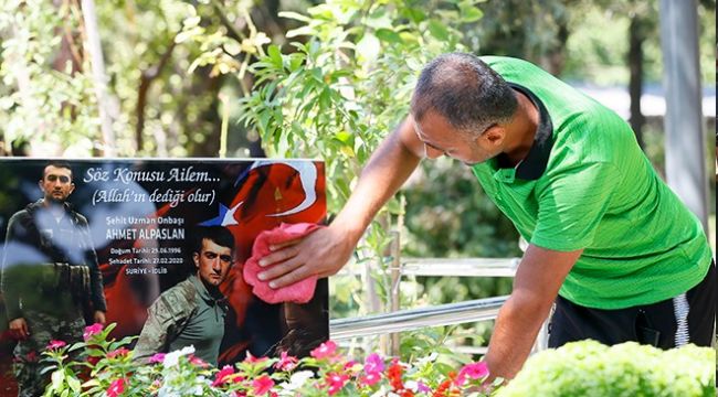 Soner Erbilgin'in 3,5 yaşındaki oğlu Ahmet de görmediği şehit amcası için dua etti. Babasının kucağında amcası için ellerini açan küçük Ahmet, sonrasında amcasının mezar taşında yer alan fotoğrafını eliyle sildi.