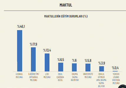 Kadın cinayeti işleyen erkeklerde de eğitim düzeyinin düşüklüğü dikkat çekiyor. Toplum içerisinde kadınların okuma zorlukları, ailelerin tutumları, erken evlilik gibi sorunlar göz önüne alındığında ortaya çıkan eğitimde fırsat eşitsizliğine rağmen, cinayet işleyen erkeklerin de yüzde 77’si ortaokul ve altı eğitim düzeyinde. Çıkan sonuçlar ortalamaya vurulduğunda cinayete kurban giden her 10 kadından 8’inin eğitim düzeyi ortaokul ve altında. Şiddet uygulayan erkeklerin de yüzde 78’i ortaokul ve daha altı eğitim almış durumda.
