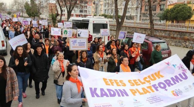 8 Mart Dünya Emekçi Kadınlar Günü’nde Efes Selçuk’ta kadınlar, erkekler, gençler ve çocuklar “Korkmuyoruz, Yürüyoruz” diyerek sokaklara çıktı. efes selçuk belediyesi ve Efes Selçuk Kadın Platformu tarafından düzenlenen yürüyüşün başlangıç noktası kentin simgelerinden olan Artemis Heykeli oldu. Kent sokaklarında slogan sesleriyle devam eden yürüyüş, Atatürk Anıtı’nda son buldu. Yürüyüş öncesi katılımcılara seslenen Başkan Sengel;“Biz kadın vicdanıyla insanlık için yürüyoruz” dedi.