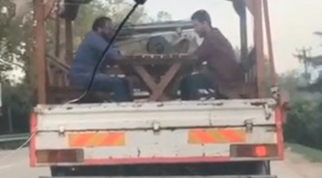 Yolda ilerleyen kamyonetin kasasındaki piknik masasında karşılıklı 2 kişinin oturduğu dikkatlerden kaçmadı. Her şey buraya kadar normal görünse de, o iki kişinin tavla oynaması "bu kadarına da pes" dedirtti.