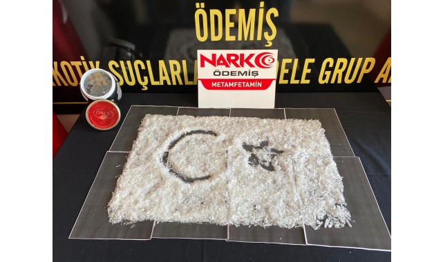 Ödemiş Narkotik Suçlarla Mücadele Grup Amirliği ekipleri, Bozdağ Mahallesi mevkiinde seyir halinde bir açık kasa kamyoneti şüphe üzerine durdurdu. Kamyonet içerisinde bulunan K.Ü., M.E. ve Ü.Y. adlı 3 kişinin tavırlarından şüphelenen polis ekipleri Cumhuriyet Savcılığından alınan izinle araçta arama gerçekleştirdi. Kamyoneti didik didik arayan polis ekipleri aracın akü bölmesine gizlenmiş ve beze sarılı halde 1 kilogram metamfetamin maddesi ele geçirdi.